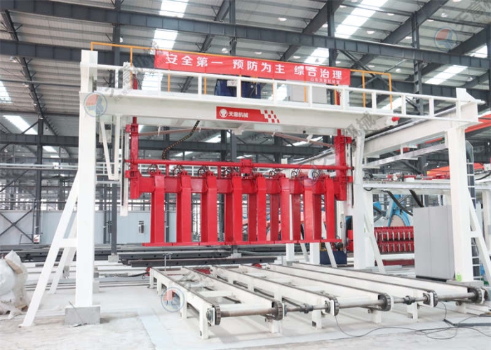 將板材吊運至板材輸送機(jī)或者將砌塊吊運至移動并坯機(jī)上;